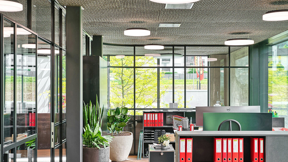 Dazu tragen auch die Stahlelemente von Forster Profilsysteme bei. Die Bürotrennwände und -abschlüsse mit den filigranen Profilen von forster presto xs schaffen offene und lichtdurchflutete Arbeitsbereiche. Brandschutzabschlüsse bilden jeweils Türen und Festverglasungen mit forster presto E30 und forster fuego light EI30/EI60. Eine besondere Lösung bietet die teleskopierbare Schiebetür: Als Eigenkonstruktion mit forster presto xs ermöglicht sie ein flexibles Öffnen und Abgrenzen des Besprechungsraums. Ein markantes Element im Eingangsbereich stellt zudem die Wendetür dar: Sie wurde mit dem System forster unico HI als Sonderlösung vom Metallbauer ausgeführt. Somit vereint der Neubau nicht nur höchste technische Präzision und gestalterische Raffinesse, sondern auch die Handschrift und Kompetenz der Merkle Metallbau AG.