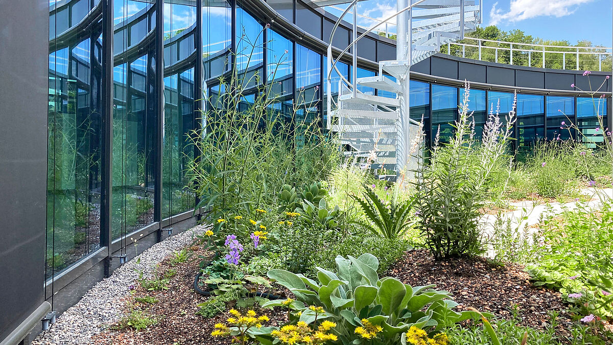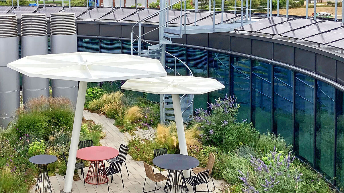 Der rund 0,75 Meter hohe Dachrand ist mit thermisch getrennten, hochisolierten Aluminiumpaneelen und entsprechenden Abdeckblechen realisiert. Zur Regulierung des Tageslichts sind auf der Aussenseite vertikale, profilgeführte Textilmarkisen installiert – sie reagieren bedarfsgerecht dynamisch auf die Lichtintensität und fahren selektiv nach unten.