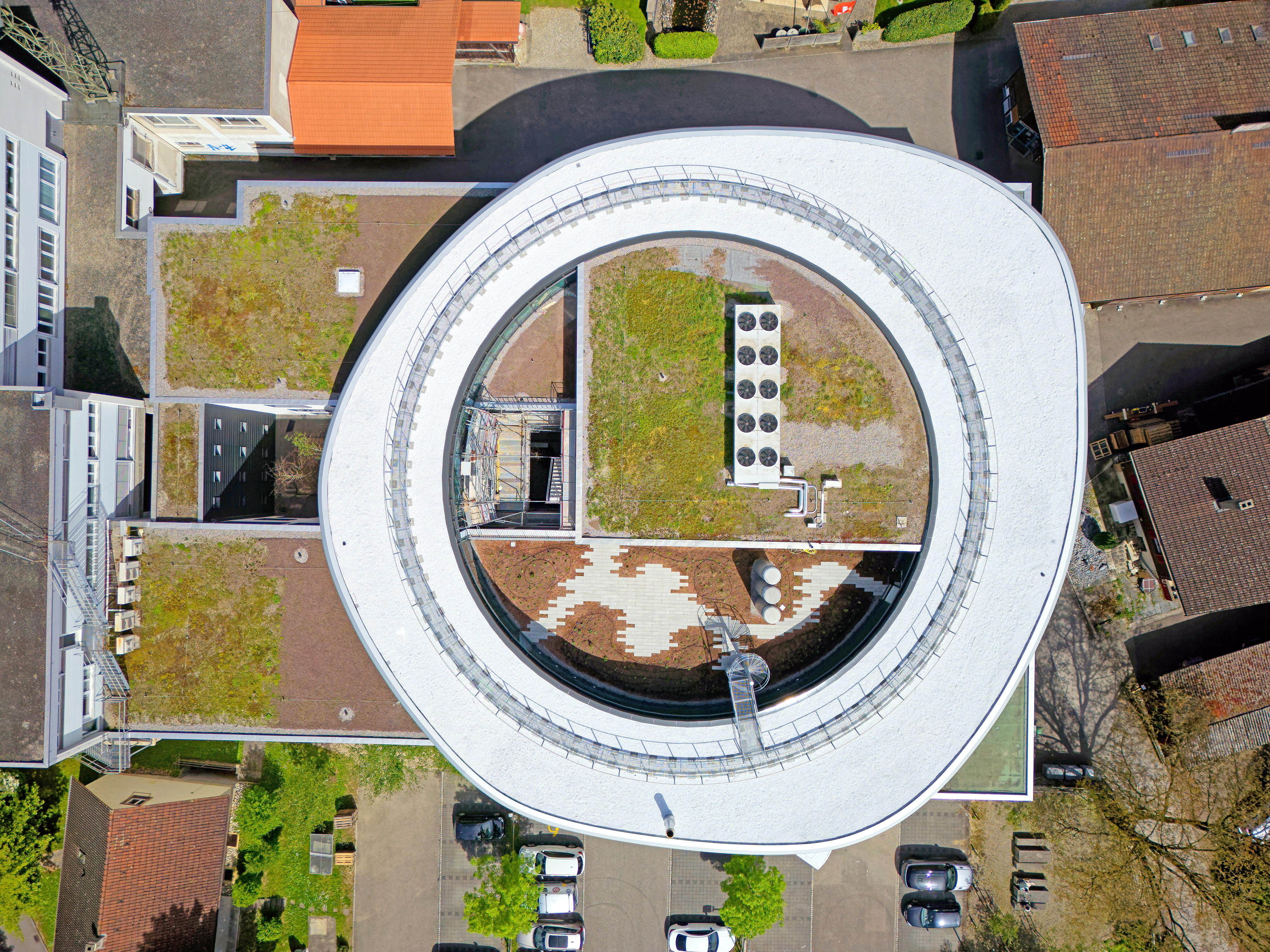 Der «Loop» – ein runder, schwebender Baukörper ohne Ecken und Kanten – liegt wie ein leichter Ring auf dem bestehenden Gewerbebau an der Dammstrasse 3 im aargauischen Frick. Designer und Nutzer zugleich ist das renommierte Architekturbüro Bäumlin+John AG. Mit seiner geschwungenen, dynamischen Form hebt sich der Aufbau deutlich vom Bestand ab und wirkt dennoch harmonisch gebettet. Die Aussenfassade besteht aus einer rundherum, aber nicht im Radius verlaufenden Verglasung mit aussenseitiger, fix montierter Brise-Soleil-Konstruktion. Die 14 übereinander angeordneten Aluminiumlamellen sorgen für blendfreies Tageslicht und erlauben gleichzeitig weite Ausblicke. Zudem prägen die Lamellen das Erscheinungsbild des Gebäudes entscheidend mit – modern, eigenständig, markant. Die innere Glasfassade des Kreisrings folgt einem gleichmässigen Radius und schafft die visuelle Verbindung zum begrünten Innenhof.