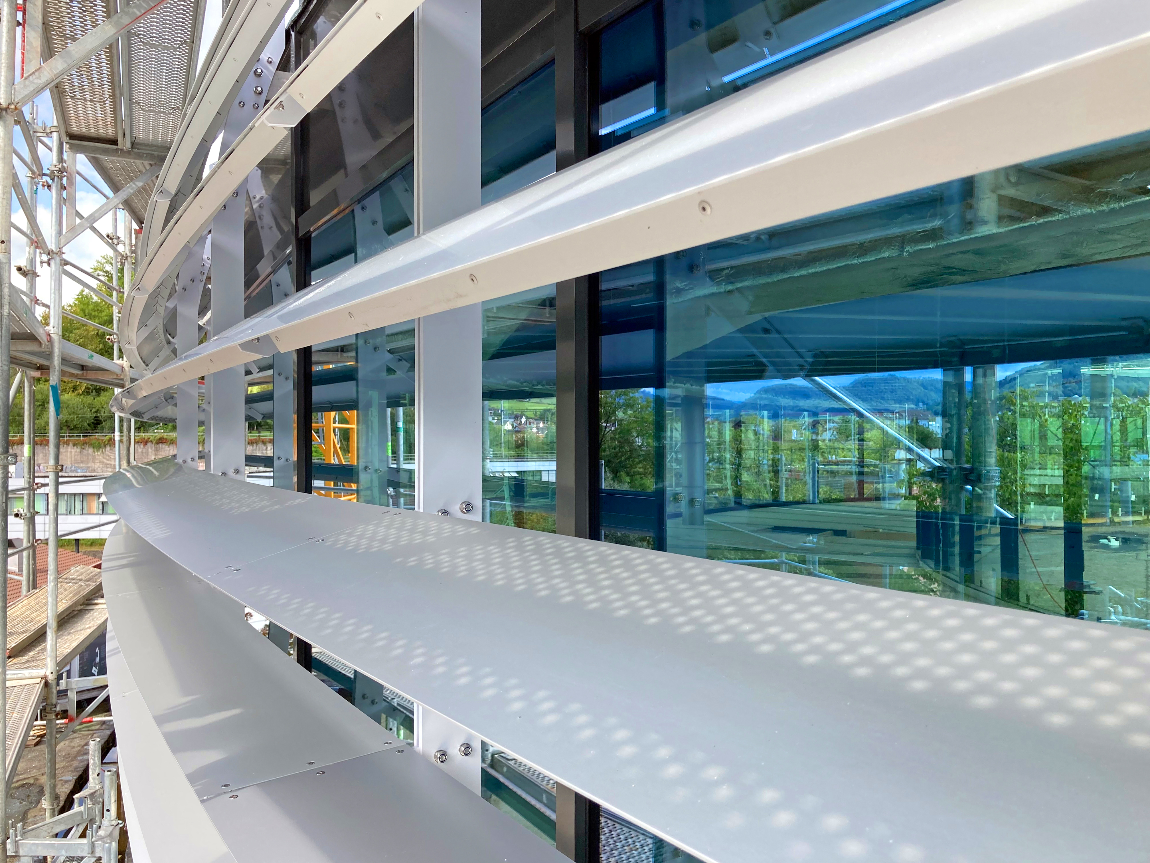Über 950 meist individuell geformte Blechlamellen, kreisbogenförmig geschnitten und mit Gewindebolzen versehen, sorgen für einen optimalen Blendschutz. Getragen werden sie von einer Haltekonstruktion aus bogenförmigen, vertikal stehenden, zweischnittig geführten Edelstahlblechen mit angeschweissten Konsolen. So konnten die Lamellen teilfixiert, in Form gedrückt und passgenau verschraubt werden – jede ein kleines Unikat.