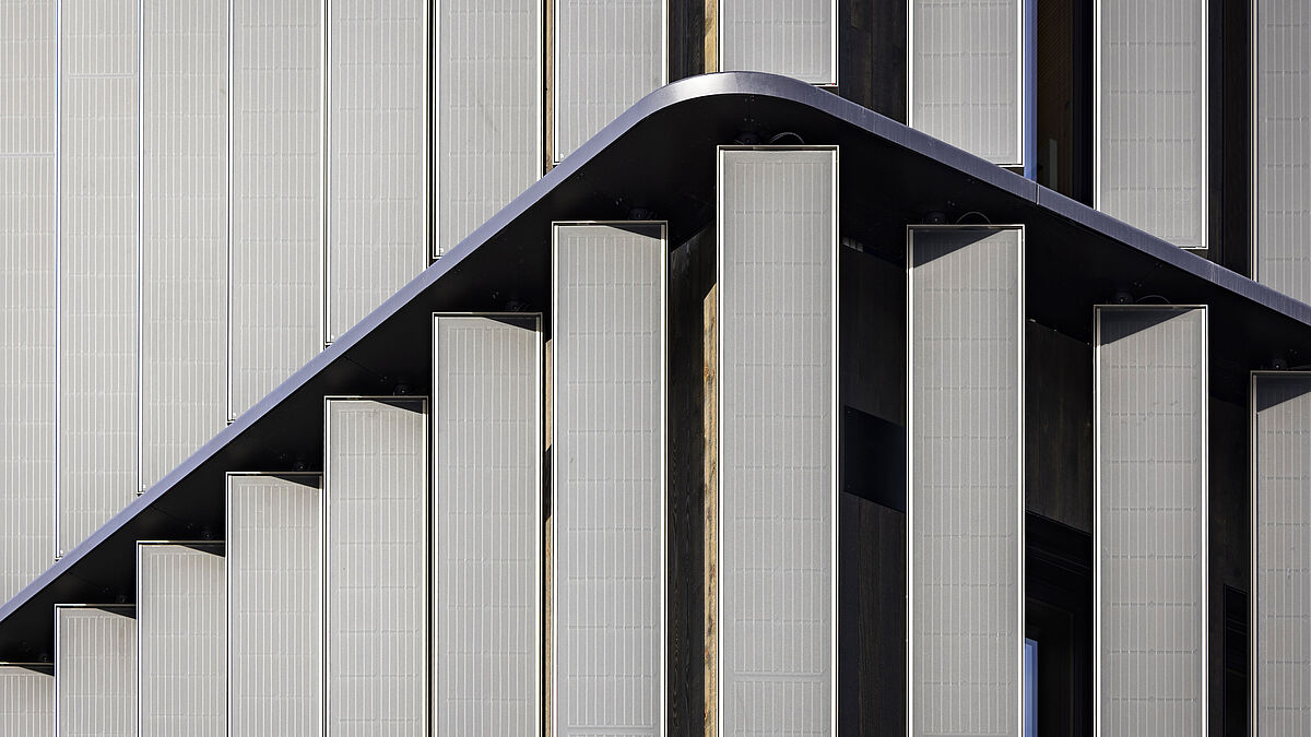 Insgesamt 114 Lamellen sind mit VSG-Glas ausgestattet, in das leistungsstarke PV-Zellen einlaminiert wurden. Die Rahmungen aus abgekantetem Alublech erlauben eine einfache Demontage im Wartungsfall. Die Kabelführung bleibt unsichtbar – sie verläuft intern durch die Lamellen, weiter in den Lisenen und schliesslich bis ins Gebäudeinnere.