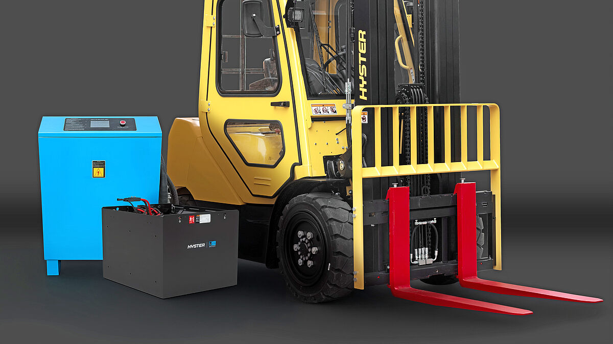 Die hochwertigen Lithium-Ionen-Batterien von Hyster wurden speziell für intensive Arbeitseinsätze und anspruchsvolle Branchen entwickelt. Ihre Technologie basiert auf Lithium-Eisenphosphat (LFP), das für seine Hitzebeständigkeit und lange Lebensdauer bekannt ist. Die Batterien sind wartungsfrei und in verschiedenen Grössen und Kapazitäten erhältlich. So lässt sich für jede Anwendung die richtige Lösung finden oder der Fuhrpark zu einem späteren Zeitpunkt ganz einfach aufrüsten. Die Ladegeräte können zusammen mit dem Hyster-Stapler direkt ab Werk bestellt werden. Zu den kompatiblen Modellen gehören die Elektrostapler der A- und UT-Serie von Hyster sowie Schubmaststapler, Gabelhubwagen, Gabelhochhubwagen und ausgewählte industrielle Lagertechnikstapler.
