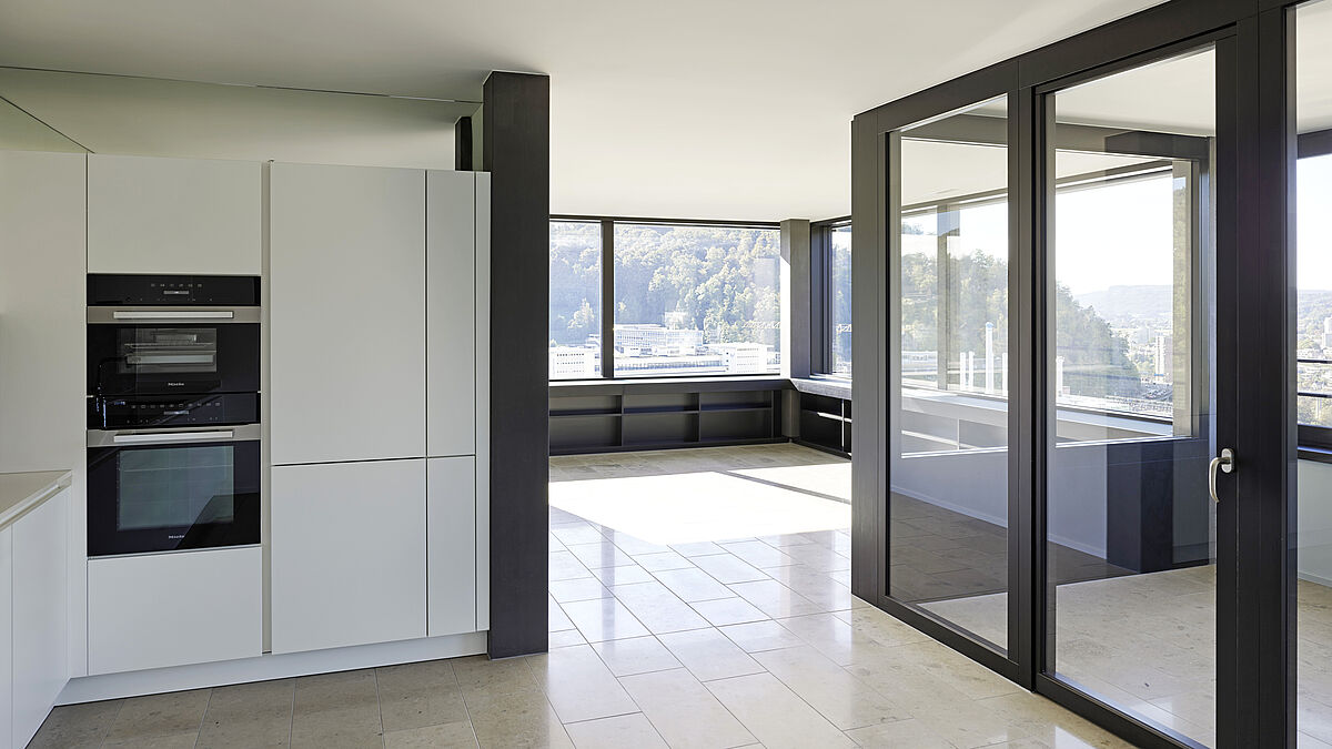 Le choix s’est porté sur la gamme de portes et fenêtres MasterLine 8 et le système levant-coulissant MasterPatio de Reynaers Aluminium après un examen approfondi des particularités du site et des exigences techniques de construction. Les deux systèmes portent le label suisse Minergie, qui garantit l’efficacité énergétique de la construction. Outre leur capacité d’isolation, leur résistance à la pression du vent et leur étanchéité à la pluie battante, ils assurent une isolation phonique élevée, décisive en raison de la proximité des voies ferrées. Ils répondent aussi aux exigences esthétiques. Ainsi, la compatibilité entre MasterLine 8 et MasterPatio permet une transition fluide entre les éléments de fenêtre et les éléments levants-coulissants, soulignant ainsi la conception rectiligne de la façade.