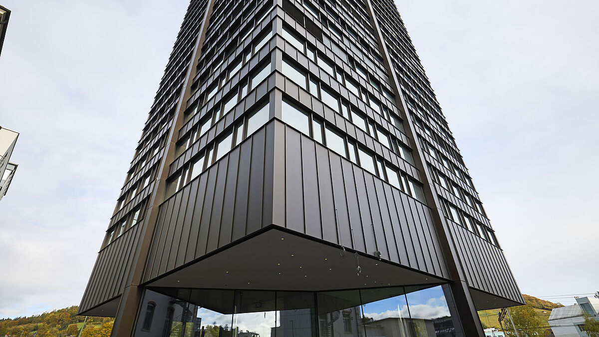La tour rassemble des espaces de vie et de travail dans un concept moderne. Avec ses six mètres de haut, son sol en pierre naturelle et ses murs en béton apparent, le hall d’entrée sert de point d’accès central et mène à 150 appartements locatifs répartis sur 15 étages. Les appartements vont de 1,5 à 4,5 pièces. Quatre ascenseurs sont disponibles : deux desservent les bureaux et les surfaces commerciales des trois premiers étages. Les deux autres sont réservés aux résidents. La terrasse panoramique sur le toit du 20e étage peut être réservée par les locataires pour des événements privés et professionnels.