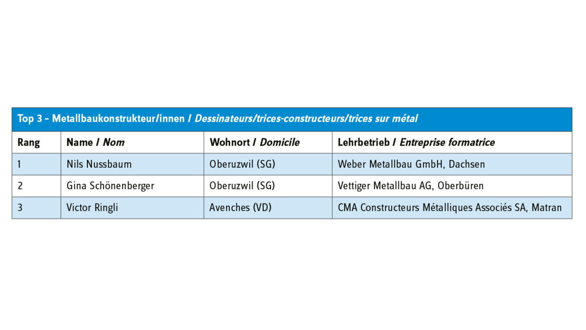 Les meilleurs jeunes professionnels se sont mesurés les uns aux autres pour la quatrième fois lors des championnats nationaux des métiers qui se sont déroulés du 17 au 21 septembre à Berne. Plus de 1000 concurrents représentant 92 métiers différents ont participé à cette compétition. Les deux métiers de la construction métallique étaient également représentés. Au final, ceux qui ont dominé la compétition et remporté les médailles d’or sont Tim Basler d’Esslingen (ZH), constructeur métallique, et Nils Nussbaum de Oberuzwil (SG), dessinateur-constructeur sur métal.