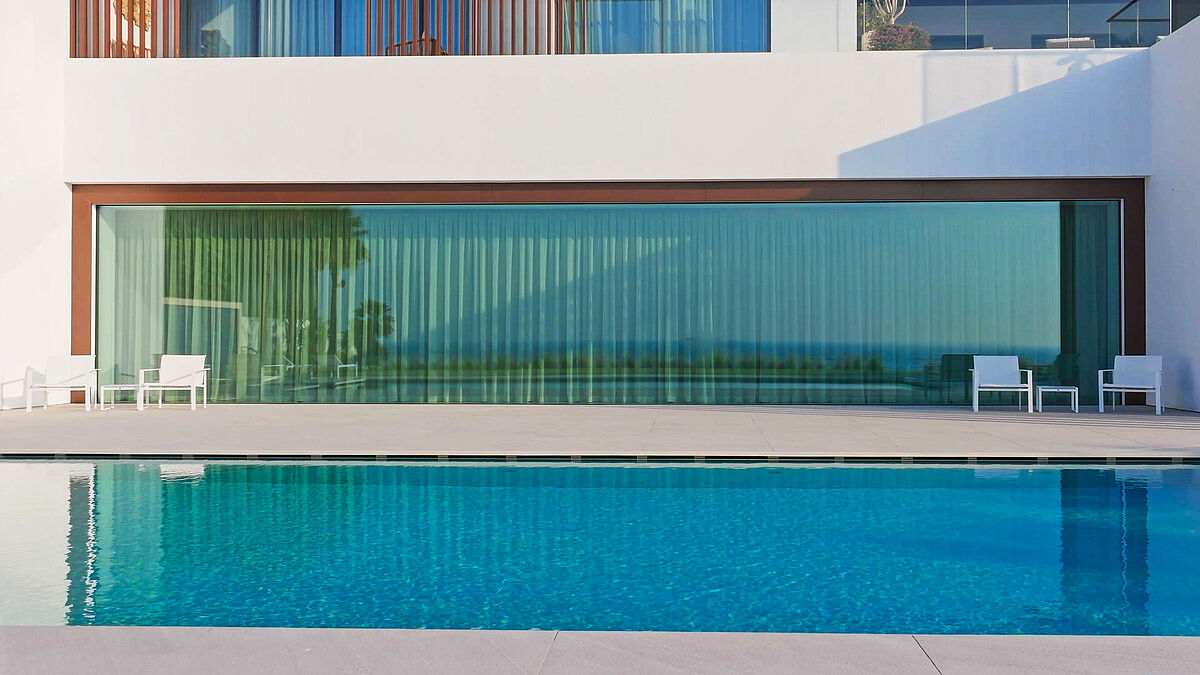 Les nombreuses années d’expérience et les compétences techniques d’Air-Lux ont permis de réaliser une fenêtre escamotable aux dimensions record: cet élément en verre isolant triple monobloc affiche une largeur incroyable de 16 m et une hauteur de 3 m pour un poids de 7,5 t. Cette façade vitrée unique et immense caractérise la villa et définit de nouveaux standards dans le monde entier. Une simple pression sur un bouton et toute la façade vitrée peut être abaissée dans le sol, créant ainsi une liaison parfaite entre l’intérieur et l’extérieur.
