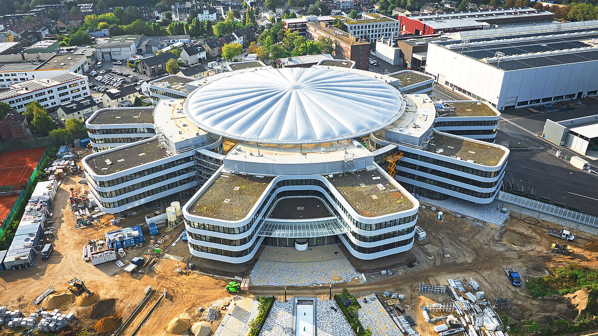 SMS Group rassemble ses sites sur son nouveau SMS Campus à Mönchengladbach. Cinq modules de bureaux forment ensemble une structure de roue dentée. Ils sont regroupés autour d’une grande cour intérieure surmontée d’un toit spectaculaire en coussins.